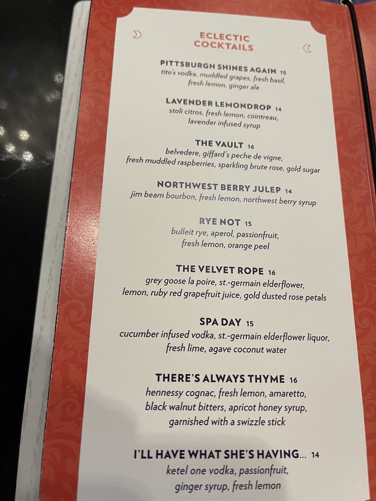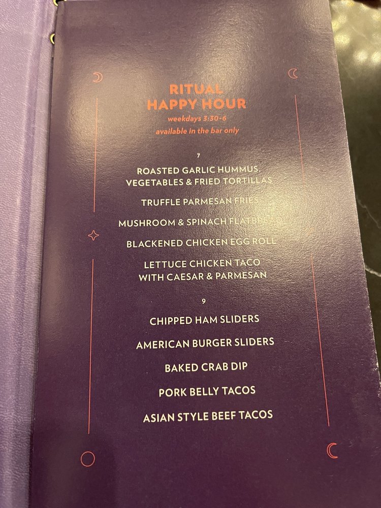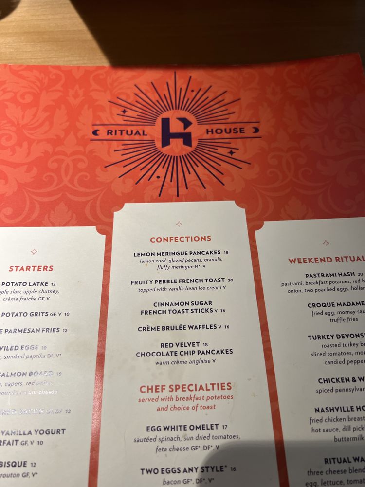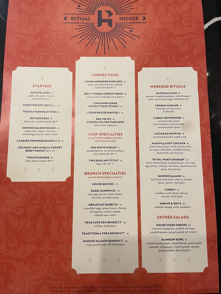 Introducing the menu at Ritual House, a wine and cocktail bar also offering breakfast and brunch options in Pittsburgh, PA. The restaurant provides a trendy, upscale atmosphere with garage parking and waiter service. Customers rave about the friendly staff, Instagram-worthy drinks, and delicious food. From deviled eggs to shrimp & grits, the menu offers a variety of tasty options like Crab Benedict, Monte cristo, and breakfast tacos. The ambiance is described as a fusion of classic meets modern meets Asian, with unique cocktail options like the refreshing Spa Day. The service, atmosphere, and presentation of dishes are highlighted, making Ritual House a must-visit for a cool and delightful dining experience.
